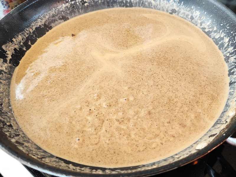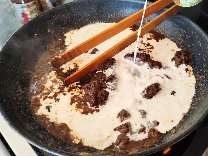 4. Do pánve k výpeku přidáme Shiitake pastu, lehce zarestujeme a přilijeme smetanu. Promícháme do hladké konzistence a 5 minut mírně povaříme.