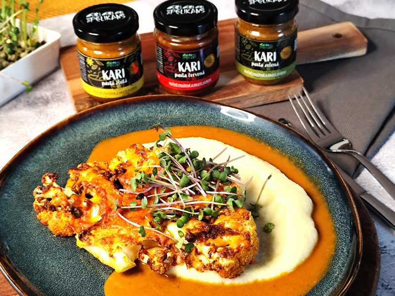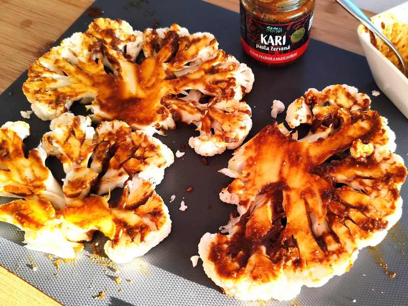 - V malé misce smícháme olivový olej a kari pastu a plátky květáku jí potřeme. Květák dáme na plech vyložený pečícím papírem a povrch posypeme strouhaným sýrem.