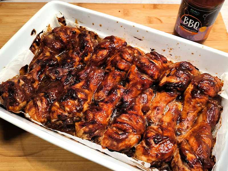 4. Pečeme v předehřáté troubě na 170 °C 40-45 minut. Poté vyndáme a povrch potřeme lehce ještě jednou BBQ omáčkou.