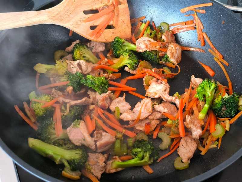 - Na pánvi rozpálíme olej, vložíme maso a brokolici a zprudka orestujeme. Přidáme ostatní zeleninu a znovu orestujeme.
