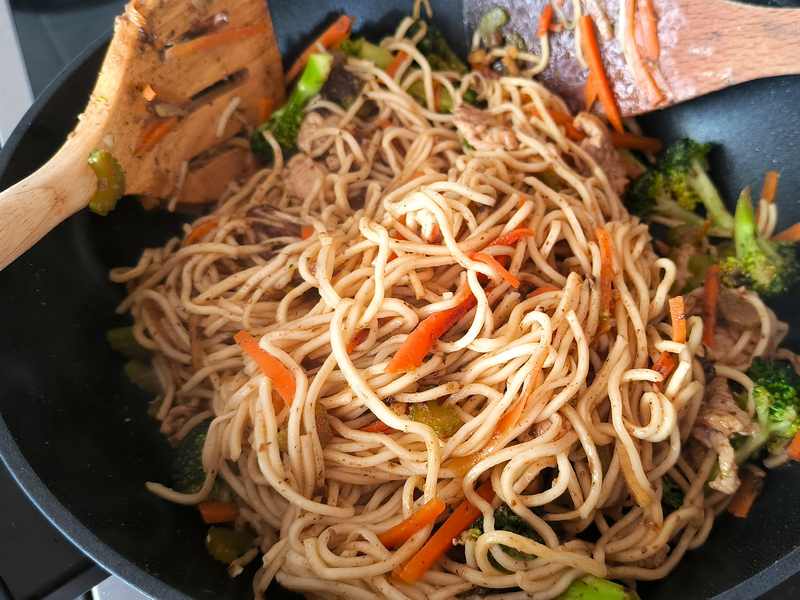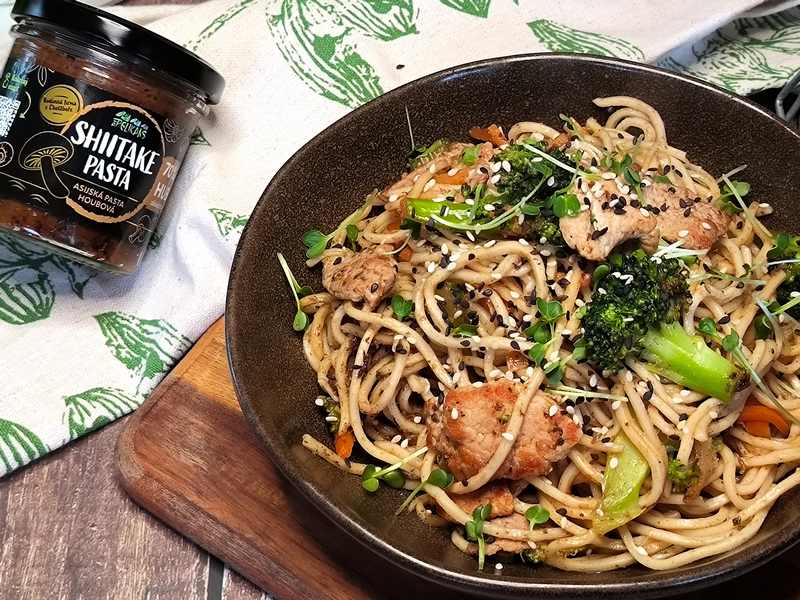 - Vložíme uvařené nudle a shiitake pastu, promícháme a společně ještě dvě minutky zarestujeme.